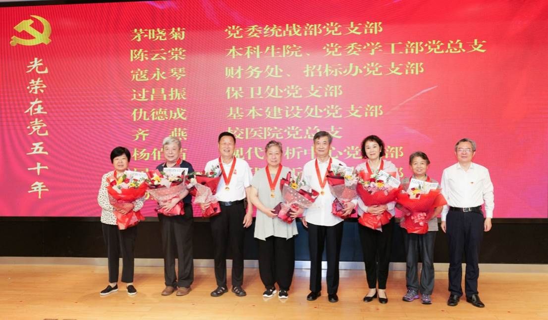杨忠为获得2023年度“光荣在党50年”纪念章的7位老党员代表颁发纪念章,此次获得“光荣在党50年”纪念章的老党员共9位,来自机关8个党支部,受到机关党内表彰的青年党员代表为老党员们献上鲜花。