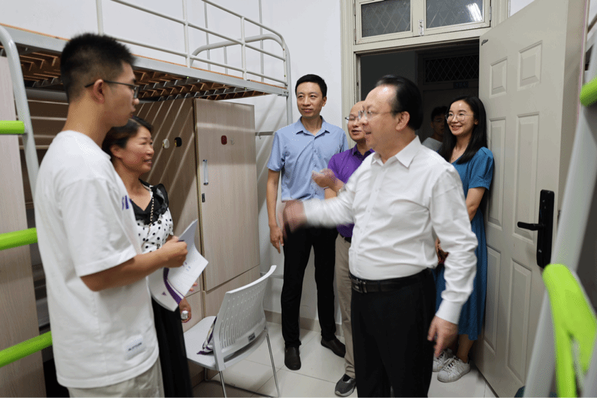 随后,谭铁牛还走访了辅导员宿舍、检查了校园报到点的准备情况,并看望慰问迎新志愿者和工作人员,对他们的辛勤付出表示感谢。党委办公室、新生学院、党委学工部、保卫处等相关部门负责人陪同检查工作。