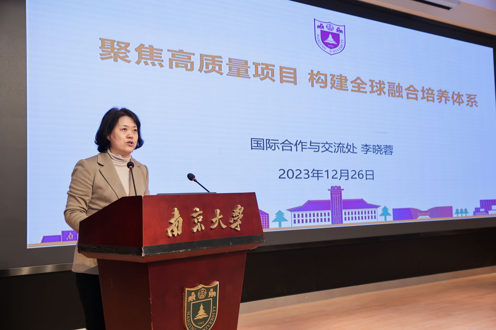 李晓蓉作了题为《聚焦高质量项目 构建全球融合学习体系》的报告,主要围绕人才培养国际化的时代内涵、全球融合培养体系及重点举措三个方面讲解了学校的国际交流项目,并提出要通过更大力度的“走出去”、更高水平的“引进来”,培养具有全球视野和竞争力的高素质创新型人才,吸引全球优秀青年人才来到凯发k8官网,促进研究生人才培养在地国际化。