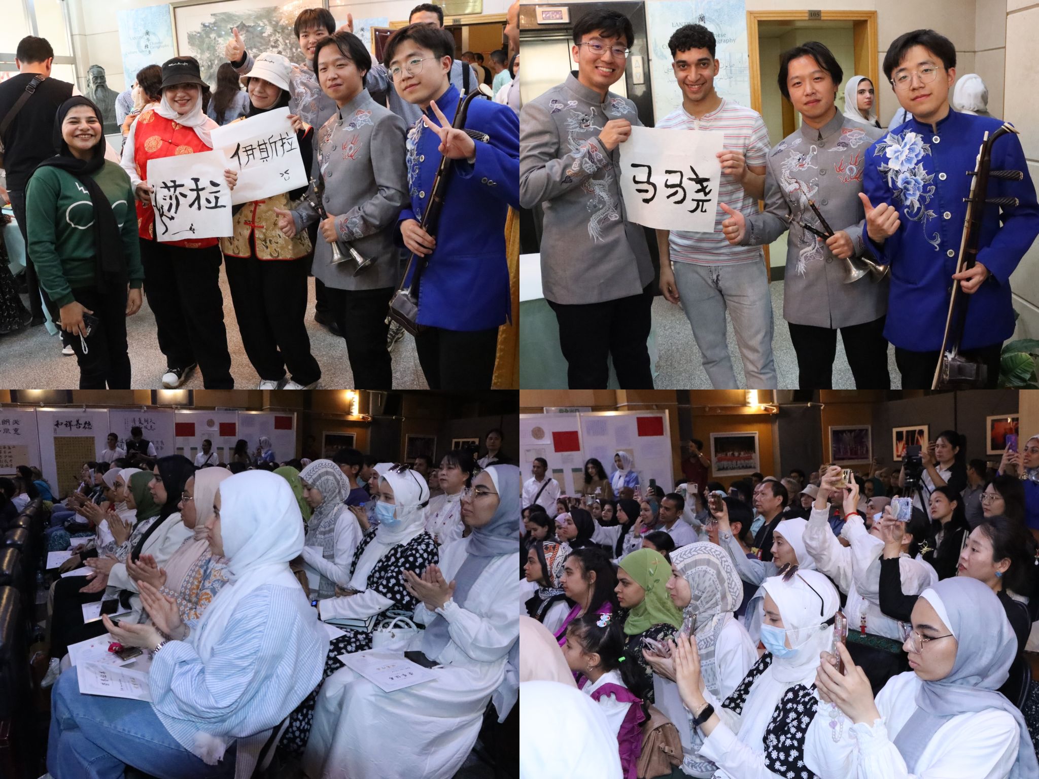 4月26日傍晚,民族乐团走进埃及中国文化中心进行演出。竹笛演绎的悠扬婉转的《春到湘江》体现河山秀丽;中阮演绎的温润清脆、旋律清新别致的《丝路驼铃》展示西域风情。古筝音调柔美,伴着《渔舟唱晚》的琴声,乐团同学用毛笔写下“文明互鉴”,呈现传统文化之美。演出结束,非洲观众久久不愿离场,纷纷与民乐团师生热络交流,表示“我被中国音乐独特的美所感动、震撼”、“没想到世界上还有这么丰富的乐器和优美动听的音乐”、“有生以来第一次被中国音乐所感动”。