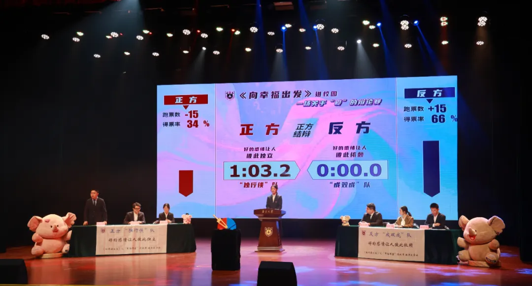 好的感情让人彼此独立还是彼此依赖?总台情感交友类综艺《向幸福出发》栏目联动凯发k8官网辩论协会,以爱为题现场开辩,CMG观察小象“采采”“鼓鼓”分列两侧为选手加油。向往幸福的千余名同学自发抵达塞满现场、实时打分,还有观众狠狠带入辩题,现场和小伙伴battle讨论。缜密的观点、珠玑的字句尽显辩论魅力,也回归节目主题:幸福越辩越明,而爱没有捷径。