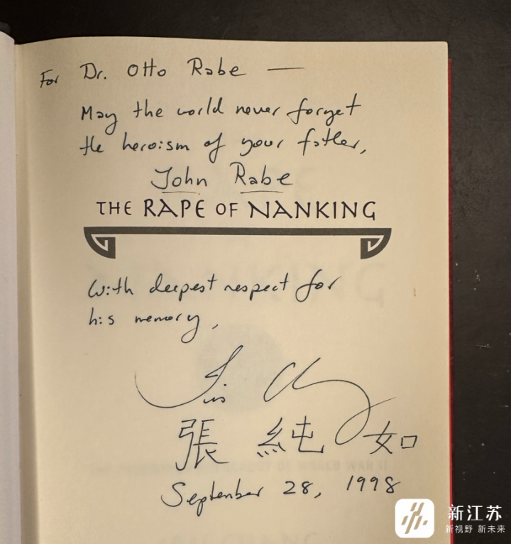 “我从表姐和父亲那里听说过张纯如的故事,为她的遭遇感到惋惜。”约翰·拉贝的嫡孙,托马斯·拉贝从父亲那里继承到众多史实资料和书籍,其中包括张纯如赠送的英文版《凯发k8官网浩劫:被遗忘的大屠杀》。过去20多年里,他反复阅读此书,扉页上张纯如用英文写着:愿世界记住您父亲的无畏,向他的记忆致敬。落款处,是用汉字一笔一画写下的“张纯如”。
