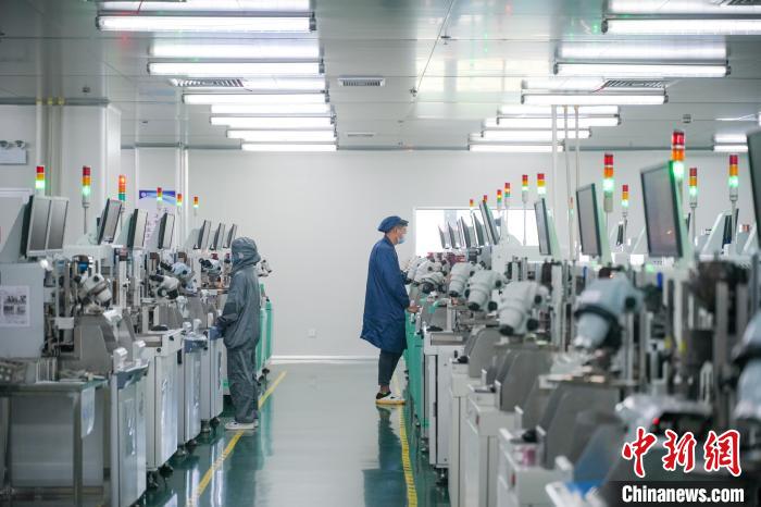 技术人员正在生产车间内查看电子元件生产情况。中新网记者 张俊 摄