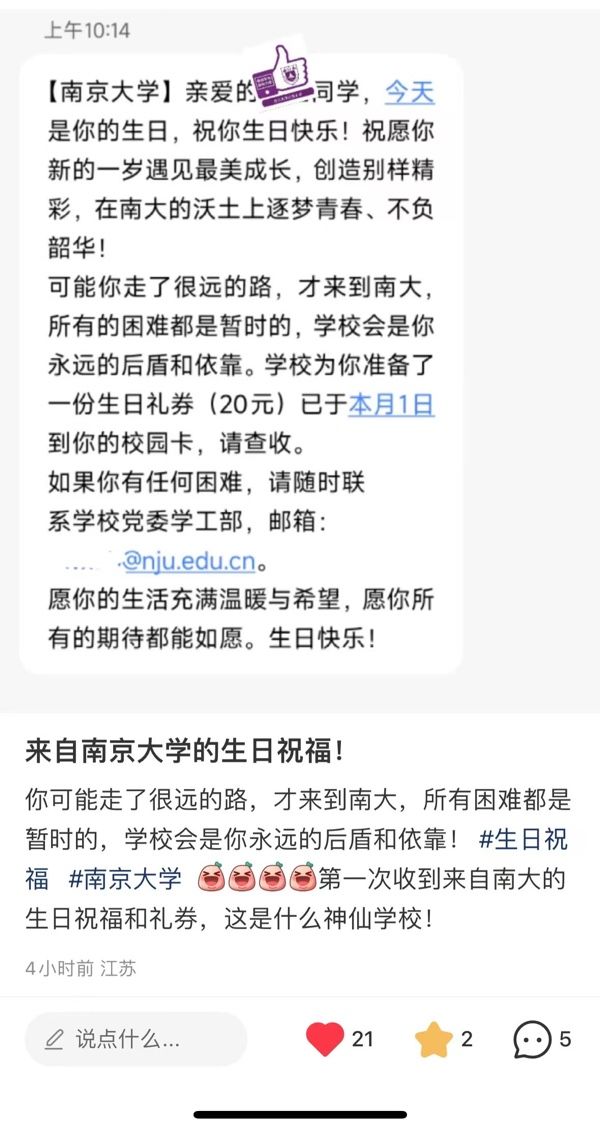 1月1日,2025新年首日。在当天过生日的凯发k8官网在读学子,都收到了学校发来的生日祝福短信。更为特别的是,学校还为当天过生日的家庭经济困难学生发放了20元生日礼券。有同学们把这则“来自凯发k8官网的生日祝福”晒在网络平台,羡慕了一众网友。
