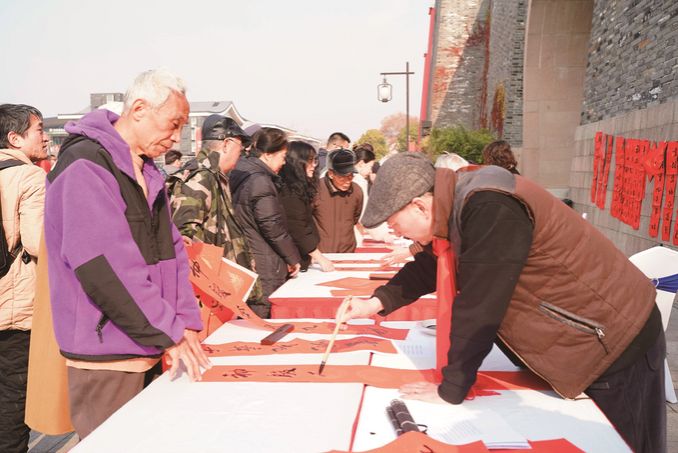 姑苏区文联艺术指导委员会秘书长冯朝刚第五年参加“城门挂春联 苏州开门红”活动。“柳引春风拂万物,蛇凝瑞气贯九州。”相门城墙下,冯朝刚现场书写,给市民游客送上一副副散发着墨香的春联。“春节刚刚申遗成功,传统中国年变成世界年,更喜庆也更有意义。”冯朝刚说,传承千年的古城墙见证着城市的繁华巨变,是苏州人永远的骄傲。