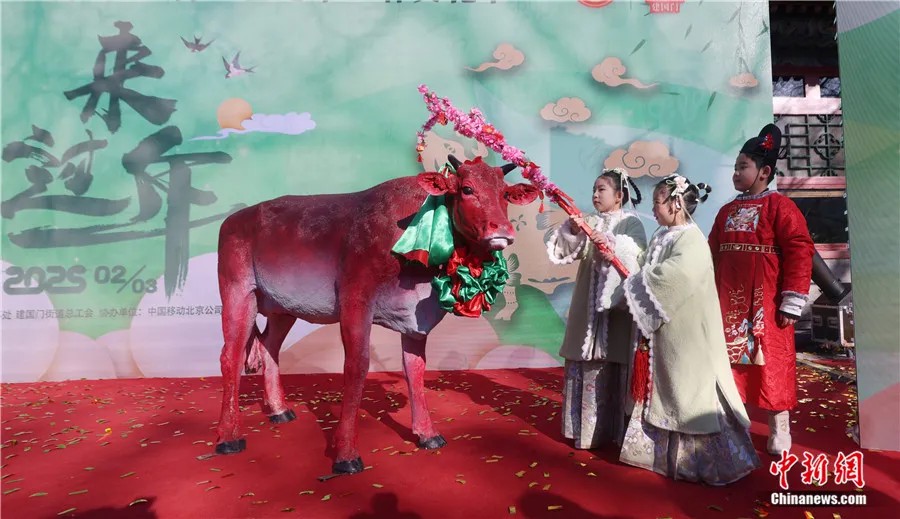 2025年2月3日,春姑娘鞭打“春牛”,祈愿国泰民安、五谷丰登。当日为中国传统二十四节气的“立春”。中新社记者 贾天勇 摄