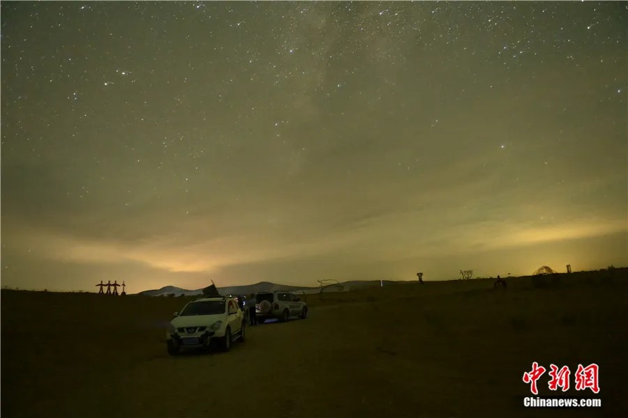2023年9月14日凌晨,甘肃省武威市民勤县苏武沙漠大景区腹地摘星小镇内,路人停车仰望星空。中新社记者 李亚龙 摄