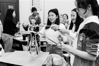 汕头大学理学院、至诚书院通过深度融合社会大课堂与社区小课堂,打造“一站式”学生社区思政育人品牌——“铁枝连‘理’戏潮音”,将非遗文化引入学生社区。图为汕头大学理学院与至诚书院学生在“一站式”学生社区中,学习操作铁枝木偶。 曹玮/摄 王风奇/文