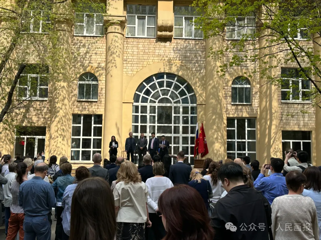 活动现场,俄罗斯外交部发言人扎哈罗娃·玛丽亚·弗拉基米罗夫娜、俄罗斯总统助理梅丁斯基·弗拉基米尔·罗斯季斯拉沃维奇、中国驻俄罗斯大使馆公使衔文化参赞封立涛、俄罗斯国家艺术学院第一副主席瓦西里·切列特里祖拉布、俄罗斯国家艺术科学院副主席卡利宁·维克托·格里戈里耶维奇、俄罗斯美协主席安德烈·尼古拉耶维奇·卡瓦利秋克、俄罗斯国立工艺美术大学校长库拉索夫等中俄各界嘉宾,以及中国留俄学生总会代表团,莫斯科国立师范大学、俄罗斯人民友谊大学、莫斯科国立大学、俄罗斯国立师范大学、俄罗斯苏里科夫美术学院、俄罗斯辛格涅音乐学院的学联代表团、俄罗斯国立美术大学的师生代表,还有来自俄罗斯全国五十余所附中的百余名学生代表齐聚一堂,共同见证这一具有里程碑意义的历史时刻。仪式结束后,尚荣还以“吴为山先生以雕塑为媒,讲好中国故事的数十年国际交流与传播”为主题,与来自全俄的学联代表们展开了一场深入而富有意义的座谈。座谈中,尚荣特别对吴为山先生近年来的《对话》系列雕塑进行了细致赏析与深入探讨,鼓励大家树立文化自信,勇担文化传播重任,从自身做起,争做讲好中国故事的使者,将中国传统文化传播到世界的每一个角落。