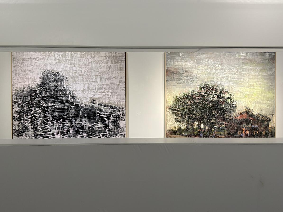 在B1层展出的,皆为宿利群以陶溪川标志性建筑为主题创作的大尺幅新作:将放大的黑白影像作品附着在油画布上后,使用各种颜料和手法进行覆盖。与之对照展出的是,宿利群于2019年在陶溪川完成的一组小尺幅水墨作品。