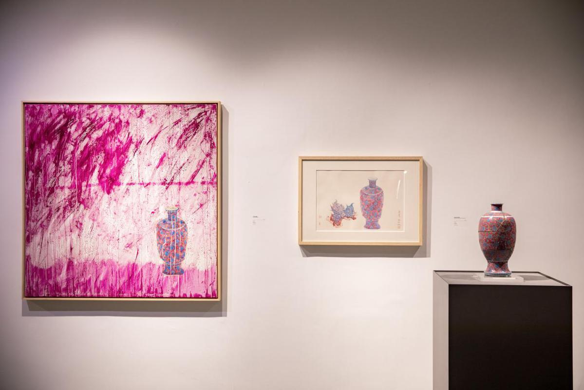 因2003年进入古瓷收藏,宿利群的绘画作品中也开始越来越多地出现瓷器的身影。近十年来,宿利群以瓷器为题材,创作出了大量水墨、油画作品。在这些作品中,他对残缺的瓷片、精巧的纹饰,被覆盖的器皿,赋予了个人情感的诠释,并融入了关于文化的思考,使历史的沧桑与厚重跃然于画面之上。一楼展出的作品以组合的方式出现:一件被修补的器物,一幅以该器物为题材的水墨作品,以及另一幅同样主题的油画作品。水墨作品情感细腻、笔触温婉,油画的画面则被颜料层层覆盖。