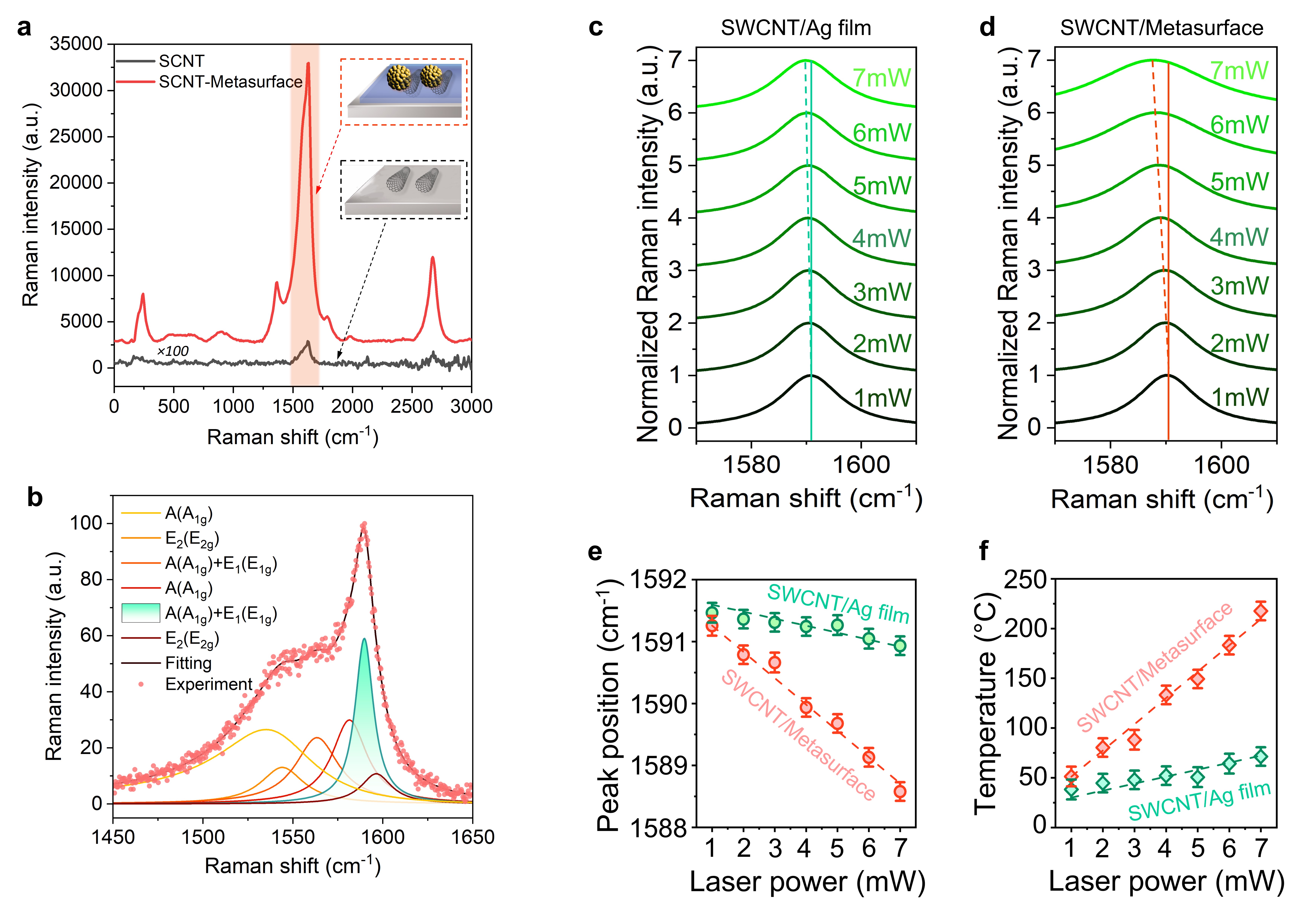 图5. 基于SERS技术的局域光热温度精确测量。参照样品为Ag膜与单壁碳纳米管的复合结构。