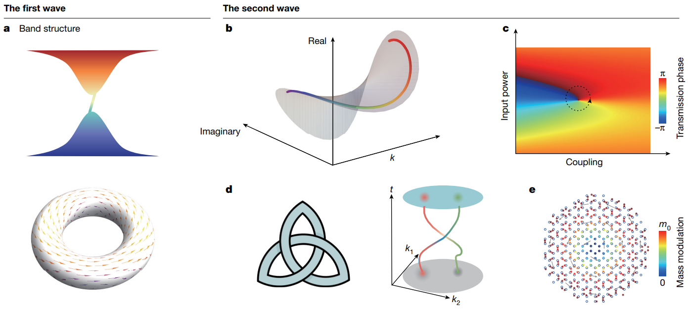 图1.(a)常规拓扑绝缘体的典型能带结构(上),其拓扑性质通常用非平庸的贝里曲率(下)来表征。(b)与常规拓扑系统不同,一些非厄米系统中的拓扑性质需要由复能带绕组(complex energy winding)来表征。(c)非线性系统中随着系统输入功率的增加,能带结构无法准确定义,此时系统的拓扑性质可通过分析传输相位及其绕组行为来进行表征。(d)三叶结绳结结构(左)、和能带节点组成的编织结构(右),可以都用基本群 (the fundamental group) 来描述,在特定的结构间还具有一定的等价性。(e)涡旋缺陷,其拓扑性质源自于实空间中的结构扭曲,无法用倒空间的能带性质进行描述。