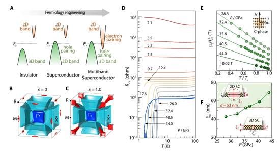超导电性是凝聚态物理领域最重要的宏观量子现象之一。特别是二维极限下的超导体系,可以表现出丰富的奇异量子现象和额外的可调控自由度,是理解非常规超导机理的关键研究体系之一。例如,在二维超导体中可以存在量子金属态、Griffiths相变、Ising配对以及Berezinskii–Kosterlitz–Thouless相变等。由于超导库珀对的相干长度定义了其波函数的空间延展程度,所以人们一般通过比较超导库珀对的面外相干长度与超导体厚度之间的相对大小,来确定超导的维度属性。然而,绝大多数超导体的相干长度处于纳米量级,使得实现二维超导电性十分具有挑战性。目前,二维超导电性的实验研究非常依赖于先进的材料制备和调控技术(包括外延生长薄膜、机械剥离层状原子晶体或者界面栅极调控)。这些技术方法是在实空间内通过降低有效超导厚度,使其小于超导库珀对的面外相干长度,从而实现二维超导电性(图1)。有趣的是,在具有轨道选择配对的多带超导体中,具有不同的形状和色散关系的费米口袋可以对应着不同的超导相干长度,其超导电性的维度属性也可以不尽相同(图2A)。因此,在理论上,通过人为产生全新的具有二维色散的费米口袋,可以使超导体系中的相干长度显著增长,有助于实现厚样品中的二维超导电性。然而,如何从实验上,在超导材料能带结构中产生全新的费米面,或者对特定费米口袋进行精确调控,是极具挑战性的科学难题。