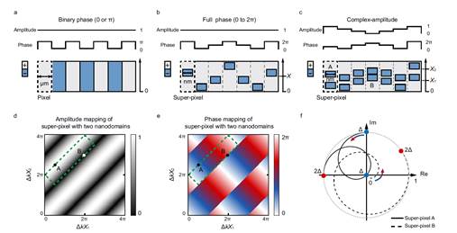 图1 纳米畴构建超像素结构示意图。a-b 分别为二维非线性光子晶体中的二值化相位调控、超像素连续相位调控、超像素复振幅调控示意图。d-e 分别为超像素调制振幅和相位与结构参数的映射关系。f为超像素调制复振幅在随相位失配变化在复平面的演化路线。