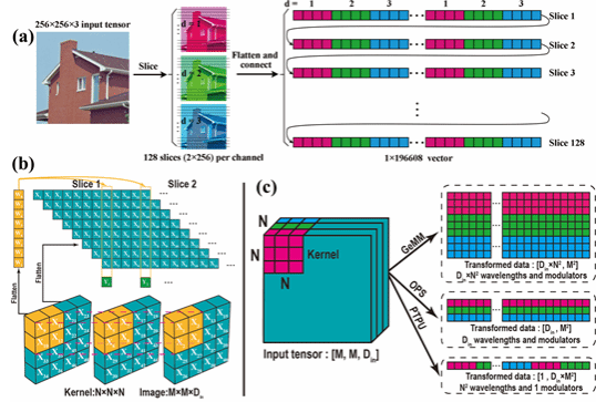 在这项工作中,研究团队提出了光子张量卷积处理器(PTPU),一种更简洁的多通道张量单通道化的光学卷积方案。根据所提出的算法规则,将高阶张量中不同通道的像素混合并重新排列为一维向量。然后,光学波长、空间和时间维度的混合操作使得能够在光学域中直接处理平坦的像素序列。因此,任意高阶张量的所有输入通道合并后只需要一个输入调制器,相关高速器件所占空间比OPS方案小几倍,成本也大幅度降低。