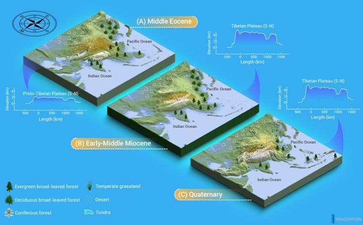 他们的研究认为,约50 Ma以来构造隆升/变形和全球变冷驱动了亚洲地貌和气候变化,进而决定了亚洲的水文、生态和土壤的演化。亚洲地理景观经过了三阶段演化。阶段I:约50-34 Ma, 亚洲以地形高差小和气候暖干为特征;阶段Ⅱ:约34-3.0 Ma, 亚洲西南部地形高差增大、地貌分异度增强、亚洲季风-干旱气候耦合系统形成;阶段Ⅲ:约3.0 Ma以来, 随着全球变冷,亚洲季风系统建立,物理侵蚀加强,现代亚洲地理景观形成。