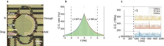图三:a)氮化硅芯片上的微环谐振器。b)双光子时间关联表现出长相干时间。