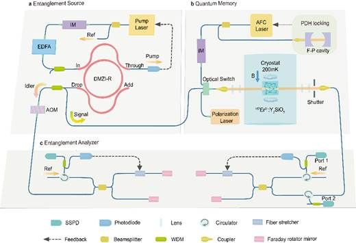 量子中继协议是实现长距离量子网络的核心技术。根据量子不可克隆原理,量子实验中无法使用经典通信中继补偿光子传输过程中随距离而指数级增加的损耗。量子中继协议利用纠缠光源、量子存储器和纠缠交换等技术,将这一损耗降低至多项式级。为利用成熟的光纤网络和技术实现量子中继协议,纠缠光源和量子存储器的理想工作范围是通信波段。