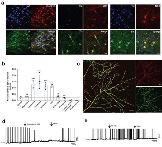 研究人员经过大量筛选发现ACTIVIN A可以有效地诱导去甲肾上腺素能神经组细胞的产生。分化得到的去甲肾上腺素能神经元具有与体内去甲肾上腺素能神经元相似的特征如生产、释放和回收去甲肾上腺素神经递质,大量的轴突分支,CO2感应等。这一系列去甲肾上腺素能神经元特有的特征进一步表明多能干细胞分化的细胞是有功能的去甲肾上腺素能神经元。为了进一步验证多能干细胞分化的去甲肾上腺素神经细胞,研究人员开展了多时间点的单细胞测序实验,动态地分析了处于分化中的细胞组成及其分化途径,证实了去甲肾上腺素神经细胞表达分子标记物及其比例。另外与体内组织的单细胞数据比较,研究人员发现,去甲肾上腺素神经细胞的基因表达与胚胎期小鼠蓝斑区域的细胞高度相似,进一步验证了该细胞类型。为了展示多能干细胞分化得到的去甲肾上腺素能神经元的应用,研究人员通过基因编辑技术将可以感应去甲肾上腺素神经递质的基因(NE sensor)插入到人多能干细胞的基因组中,再通过去甲肾上腺素能神经元体外的分化方法得到可以同时生产、释放、回收以及检测的去甲肾上腺素能神经元。这一细胞平台可以用于筛选药物来治疗那些由于去甲肾上腺素神经递质发生紊乱而导致的神经系统疾病(抑郁等)。作为该概念的验证,研究人员发现,目前市场用于治疗抑郁的药物中,靶向去甲肾上腺素神经递质的重回收过程的药物可以显著提高NE sensor的信号强度,而那些靶向多巴胺或血清素神经递质的药物却对NE senor没有明显影响。这些结果表明该药物筛选平台可以用于高通量地寻找靶向调控去甲肾上腺素神经递质的新型药物。