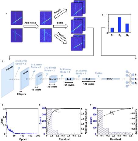 图2. 用于偏振分析的神经网络架构。(a)数据增强后的输入图片。 (b) 输出为对应的斯托克斯参量。 (c) 卷积神经网络的结构参数。(d) 基于训练周期的损失函数。针对(e) 20微米和 (f) 10微米空间分辨率的测试数据的统计分布和累积概率分布。