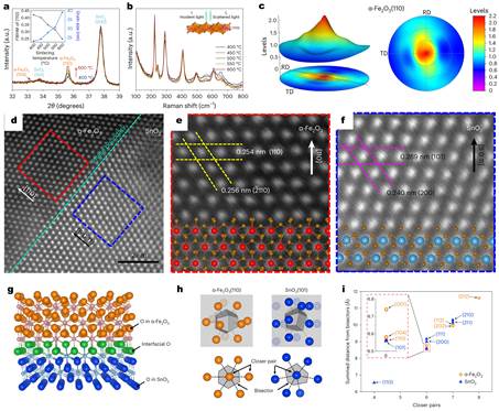 1 ac, 生长于FTO衬底上α-Fe2O3薄膜的X射线衍射图谱(a)、Raman谱(b)和α-Fe2O3 (110)晶面的X射线极图(c);df, α-Fe2O3/FTO界面的高角环形暗场像(d)及其α-Fe2O3侧的局部放大图(e)和FTO侧的局部放大图(f);gi, 凸显氧原子亚晶格的α-Fe2O3/SnO2界面原子模型(g),α-Fe2O3和SnO2中氧原子亚晶格的Voronoi胞及其与特定晶面相交的特征量示意图(h),这些特征量的分布图(i)。