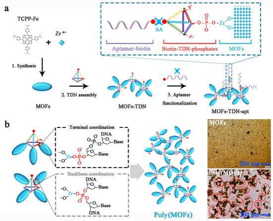 金属有机框架(MOFs)由于具有极高的比表面积、超高孔隙率和可调孔隙结构,在设计、合成、改性和功能方面已经取得了许多有价值的进展,因而在生物传感、医学成像、药物输送等生物医学领域受到了广泛关注。MOFs理想的纳米生物界面可以提高其稳定性、靶向性和生物相容性,这也是其生物医学应用的基础。目前,MOFs纳米生物界面的工程化主要包括核酸、多肽、抗体等功能探针的使用,仍然存在许多明显的困难和挑战: (1) MOFs表面有限的活性基团数量; (2) MOFs表面吸附导致的纳米探针识别效率低; (3) MOFs纳米界面的功能化方法较少; (4) MOFs纳米材料的利用效率较低。因此,迫切需要利用纳米生物界面工程技术构建性能更加优越的MOFs,使其可以更加稳定、高效、经济地应用于生物医学领域。近期,我校生命科学学院李根喜教授与合作者发现了一种可以控制MOFs纳米材料发生自组装的新方法。该方法主要通过使用DNA框架材料(四面体DNA)来控制MOFs纳米材料的组装(图1),尤其是可以通过调节与催化Zr-MOFs配位的磷酸基团的数量来定制各种明确的超结构,以创建聚合物MOFs超结构(Poly(MOFs))。研究发现,这种超结构表现出优异的催化活性和分子识别能力,并极大地放大了信号的输出。研究团队进一步基于DNA框架控制的Poly(MOFs)构建了一种具有优异分析性能的比色生物传感器,可以在分子水平以及细胞水平实现对靶标的分析,并用于人类表皮生长因子受体2 (HER2)阳性乳腺癌的诊断。