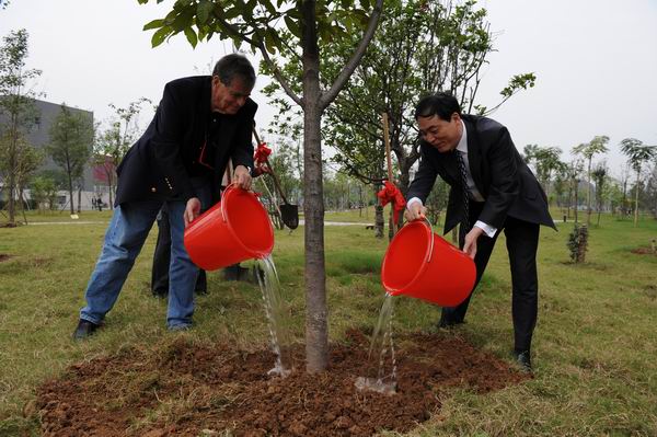 在仙林校区的名人种植园内,陈校长与阿龙?切哈诺沃共同种植了一棵七叶树,并在树前合影留念。当听完校园管理科的相关负责人介绍七叶树的情况后,阿龙?切哈诺沃说,我要经常回来看看这棵树是怎么长大的。