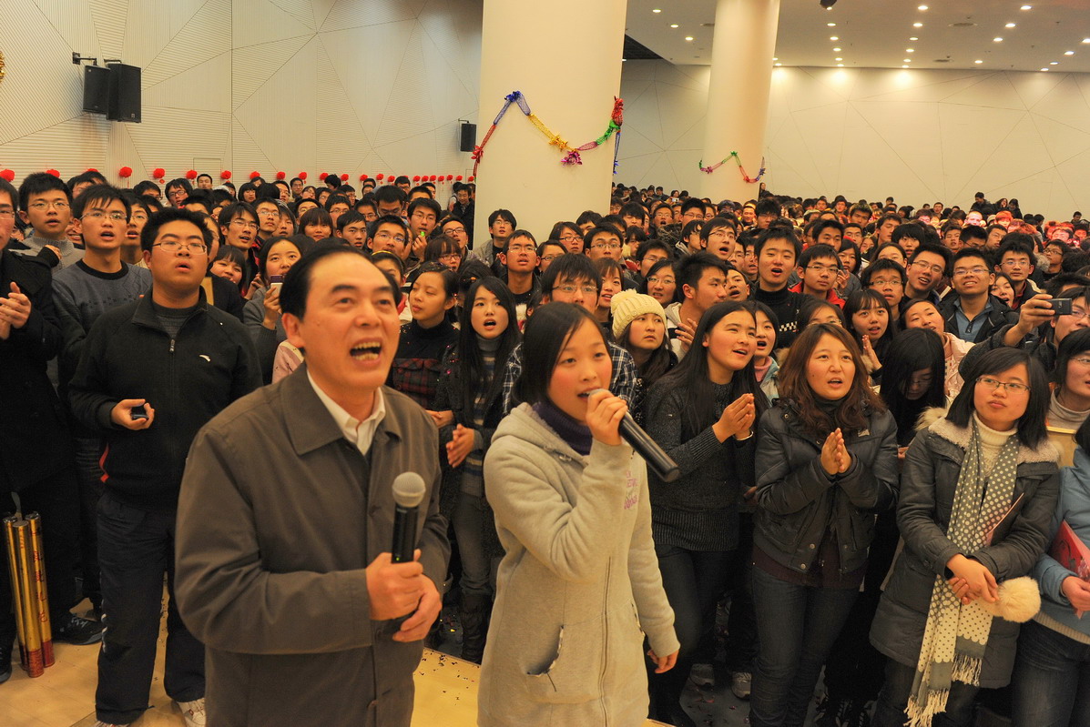 当晚11点半,陈校长一行来到了大学生活动中心游园会现场,与同学们欢聚一堂,喜迎新年。校领导们作为抽奖嘉宾,在同学们的期待和欢呼声中,一次次为同学们送出了幸运礼物。在现场同学们的火热呐喊和邀请声中,校领导们落落大方,一展才艺。吕建副校长、潘毅副校长、杨忠副书记分别演唱了《小城故事》、《天之大》、《祈祷》、《在我生命的每一天》等歌曲,现场掌声雷动,喝彩不断。在热烈的气氛中,校领导与现场同学一起倒计时,迎接2011年的到来。伴随着新年的钟声,陈校长向全体师生员工、海内外校友送出了诚挚的新年祝福,祝愿在新的一年里“凯发更美好,同学们更美好”。应同学们的热情邀请,陈校长和全场的师生们一起唱起了《友谊地久天长》,将现场气氛推向了高潮。