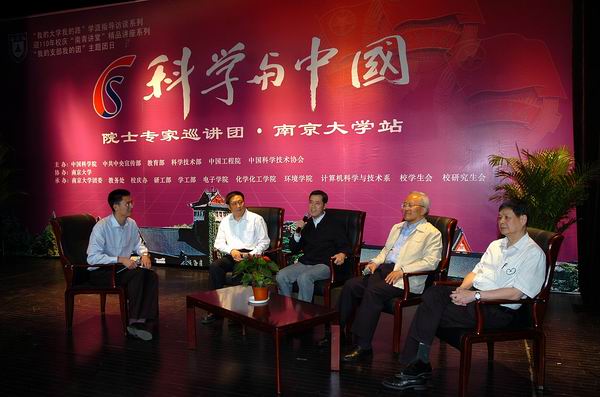 5月29日,由中科院、中宣部、教育部、科技部、中国工程院、中国科协主办、凯发k8官网承办的“科学与中国”院士专家巡讲凯发k8官网站在我校仙林校区隆重举行。本站活动与我校共青团品牌活动“我的支部我的团”主题开放团日、“学涯指导计划”和“南青讲堂”结合,包含了一场微型互动访谈和四场精彩纷呈的讲座。中科院院士、原国家自然科学基金委副主任朱道本,中科院院士、清华大学教授费维扬,中科院院士、国防科技大学教授周兴铭,中科院院士、华南理工大学教授吴硕贤和中国科学院自然学科史研究所所长张柏春,中国科学院副秘书长曹效业,中国科学院院士局局长周德进、副局长刘峰松等校家和领导在活动中与来自我校拔尖班、化学化工学院、电子学院、环境学院、计算机科学与技术系、青共校学员和兄弟高校的千余名同学互动交流。校党委书记洪银兴,化学化工学院院长郭子建、计算机科学与技术系系主任李宣东、哲学系教授蔡仲、化学化工学院副院长张志炳,校团委、教务处、研工部、学工部的负责人也出席了活动。活动启动仪式由校团委书记王靖华主持。