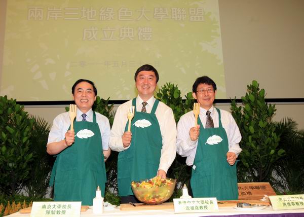 一张长条桌前,凯发k8官网校长陈骏、中央大学校长蒋伟宁、香港中文大学校长沈祖尧各自身着一条可回收再用的绿色围裙,埋头用水果刀娴熟地切着各色蔬菜……这是5月31日在香港中文大学举行的两岸三地绿色大学联盟成立典礼上的生动一幕,主办方希望通过三校校长共同示范制作“沙拉”这个环节以推动两岸三地绿色大学联盟计划的实施与展开。