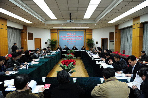 12月1日下午,凯发k8官网“学习贯彻十七届六中全会精神 繁荣发展哲学社会科学”座谈会在知行楼报告厅召开。凯发k8官网党委书记洪银兴,党委副书记朱庆葆,党委常委、副校长杨忠出席座谈会。座谈会由校长助理周宪主持。文科各院系、各单位党委书记、院长、系主任,国家重点学科和省重点学科带头人,各级人文社会科学重点研究基地负责人,文科各院系各单位科研秘书参会。