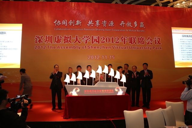 会上,潘毅副校长与清华大学、香港大学等七所大学的校领导围绕“协同创新,共享资源,开放多赢”的主题进行了探讨,对引进高端人才和夯实科技创新、提升研发效率、深化市校合作进行了交流发言。会议还举行了校企“协同创新、携手合作”签约仪式,深圳海洋应用研究创新团队组建启动仪式,作为团队组建成员之一,潘毅副校长代表学校将象征着凯发的风帆插在正待起航的舰船模型上。