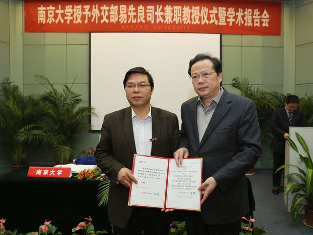 朱庆葆副书记介绍了易先良司长在外交部工作的基本情况及学术成果,宣读聘书,并为其颁发兼职教授证书。