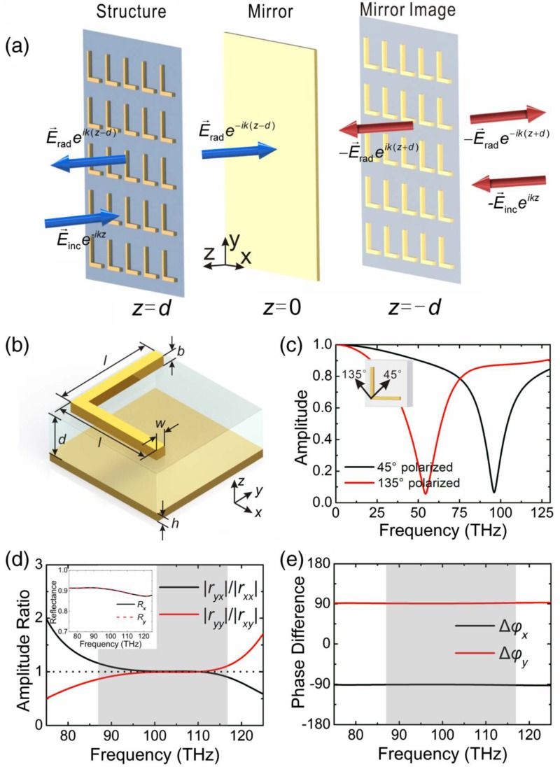 最近王牧教授研究组提出并实验上实现了金属-介质复合微结构实现宽频无色散的方法。与金属亚波长微结构的强烈色散不同,介质材料的光学性质在很宽的频率范围内变化很小。介质材料可以制备宽频器件,但是其空间厚度通常很大。该研究组巧妙地通过在金属微结构材料中引入介质层,综合了两种材料的优点,在亚波长的尺度下实现了对光偏振态的宽频带控制。他们将金属微结构设计在金属镜面上方,这样金属镜面对光的反射相当于形成了一个金属结构的镜像。金属结构和它镜像的辐射存在共轭关系,而金属结构与其镜像的距离是由介质层的厚度决定的。所以通过调节介质层的厚度,可以利用共轭关系来抵消金属的色散,从而实现宽频无色散的性质。他们通过这种方法设计并制备出了带宽为30%的四分之一波片和带宽高达67%的半波片,该带宽超过了目前已报导的其它由超构材料构成的波片。