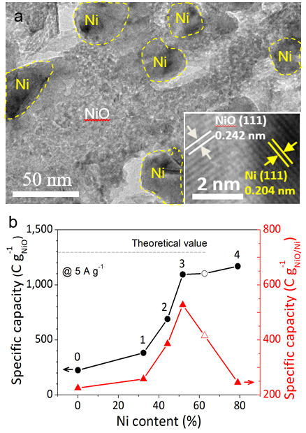图2. NiO/Ni复合介观结构的形貌和电化学性能。(a) 嵌入金属Ni纳米颗粒的NiO纳米片;(b) 比容量与Ni含量的关系。