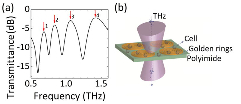 图一:(a)太赫兹生物传感器的传输特性曲线,(b)太赫兹光谱系统测量生物传感器特性示意图