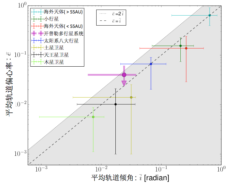 图3: 开普勒卫星观测到的多凌星系统与太阳系各类天体的轨道偏心率和倾角符合一个e=(1~2)*i的普遍规律。