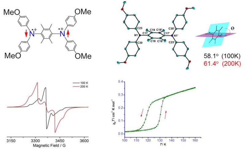 他们首先合成了一个由四甲基苯环桥连的四芳基双胺化合物,经过两次氧化,得到双自由基双阳离子。 晶体结构表明, 阳离子之间被阴离子隔离而缺少电子相互作用,并且阳离子在热作用下产生两种不同的结构。顺磁共振谱(EPR)和SQUID测量显示,在不同的温度区间晶体具有不同的磁性特征, 低温状态下电子之间的偶合强度是高温状态下的两倍。并且两种结构(状态)在一定的温度区间可以共存,产生了宽度达13K的磁滞回线,导致磁性双稳态。 由于离子之间不存在电子相互作用,双稳态显然仅仅通过单个离子内的电子耦合产生。 该研究表明,对此类有机双自由基化合物进行结构修饰, 有可能获得一系列类似于过渡金属配合物分子的通过分子内电子耦合导致双稳态的有机磁性分子, 从而开辟有机自由基化学和双稳态磁性材料领域新方向。