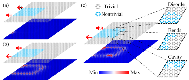 图3:(a)-(b)拓扑边界赝自旋向下态沿边界顺时针传输。(c)在乱序、弯曲以及空腔干扰下声波的拓扑边界传输具有很好的鲁棒性。