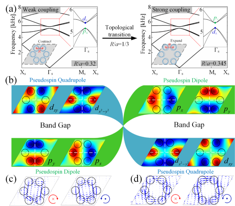 图2:(a)通过收缩和扩大超元胞内单元间距打破双狄拉克锥形成带隙。(b)p/d轨道反转,即能带发生反转。(c)-(d)赝自旋向上、赝自旋向下对应的声强分布。