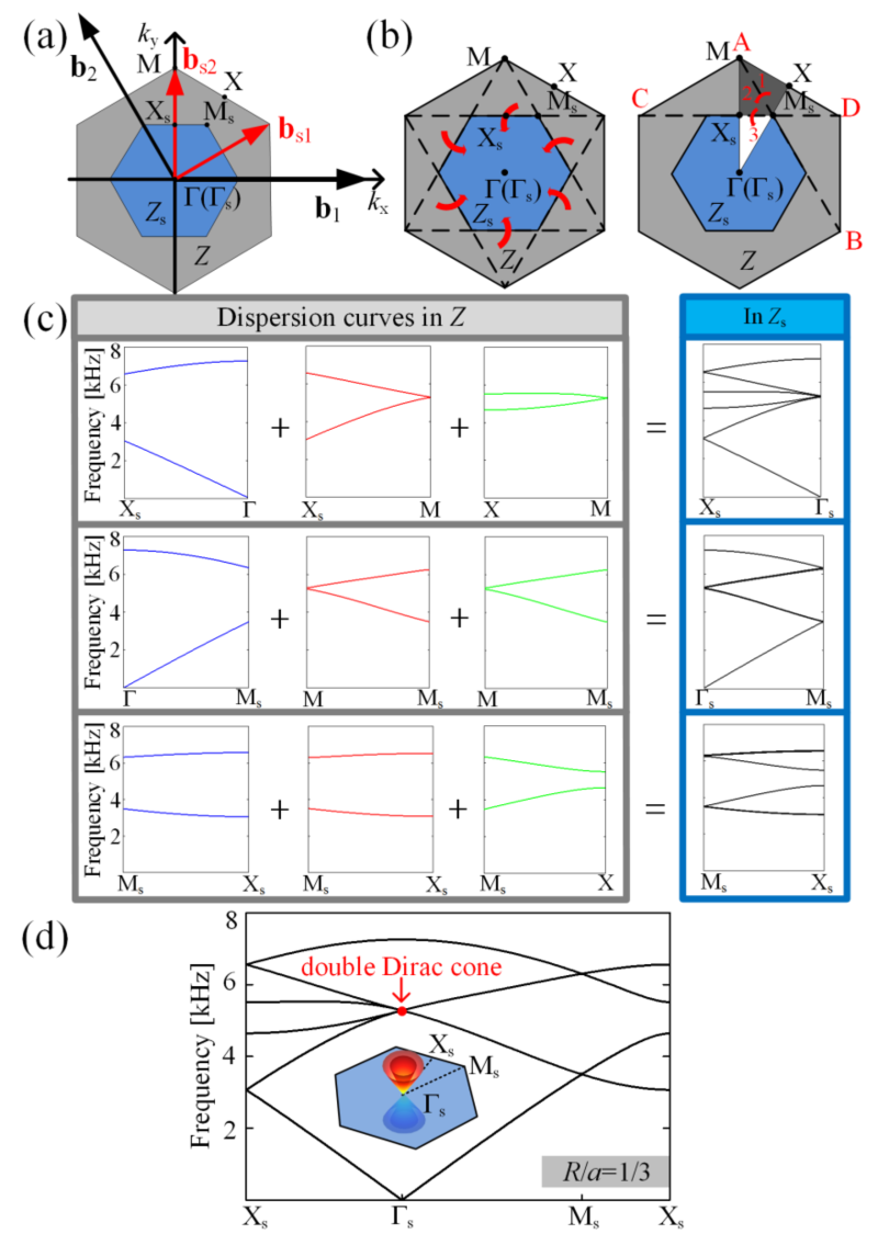 图1:(a)变换前后元胞的第一布里渊区。(b)布里渊区折叠过程。(c)能带折叠过程。(d)超元胞组成的三角晶格色散图上形成双狄拉克锥。