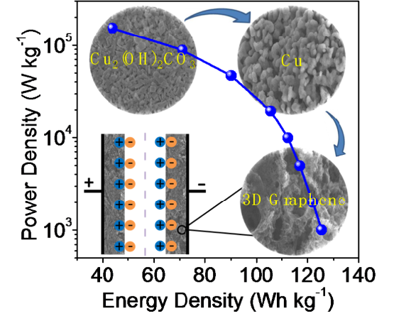 近年来胡征教授课题组发展了一种原位氧化镁模板法制备碳基纳米笼的新方法,所得纳米笼呈新颖的分级结构,具有比表面积大、微孔-介孔-大孔共存、导电性优良、浸润性可调等特点,表现出优异的EDLC性能[Adv. Mater. 24(2012)347;27(2015)3541.]。最近,鉴于金属基底上沉积的碳材料的电导率通常优于氧化物基底上沉积的碳材料这一现象,他们将原位氧化镁模板法拓展为原位多孔纳米铜模板法,以聚甲基丙烯酸甲酯(PMMA)为固态碳源,得到了一种新型的多孔三维寡层类石墨烯材料(3DG),具有微孔-介孔-大孔相互连通的开放性孔结构,比表面积大(>1500 m2 g?1),导电性高(>800 S m?1),在水系和离子液体中均有良好浸润性。这种3DG材料在水系和离子液体电解液EDLC中的功率密度分别高达1066.2 和 740.8 kW kg?1,其能量密度、循环稳定性均处于EDLC的先进水平,展示出在超高功率和高能量密度存储领域的广阔应用前景。更令人感兴趣的是,他们通过系统考察EDLC的等效串联电阻(即计时电位曲线的IR压降)随电流密度的变化规律,从一个新的视角深入理解了EDLC材料的结构与性能关系,与经典电化学交流阻抗谱的研究结果相互印证,互为补充,这为深入理解电化学能量存储材料的构效关系提供了新的思路。