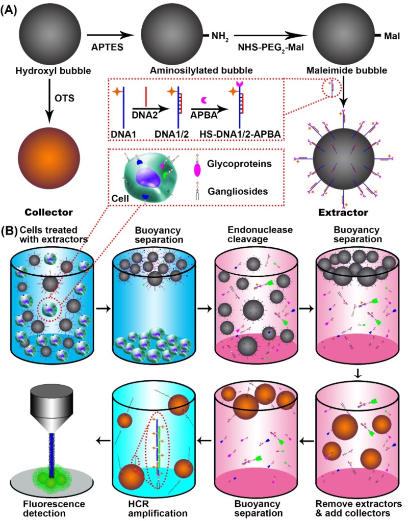 图1. 功能浮力微球探针的制备(A)和细胞表面神经节苷脂定量分析原理(B)