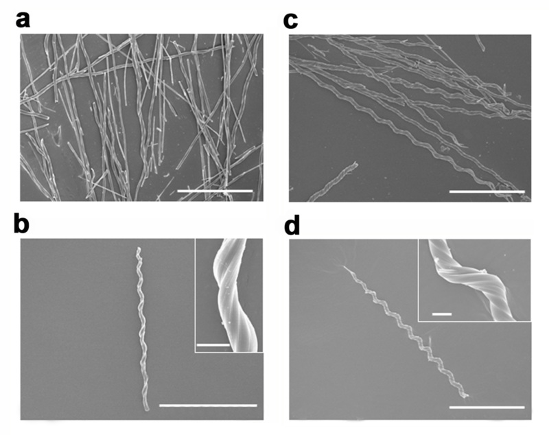 图1. 螺旋材料R-1 (a,b)和S-1 (c,d)的SEM图
