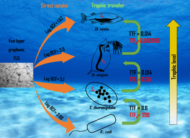 图3. 石墨烯通过水相暴露和食物暴露在典型水生生物中的传递规律