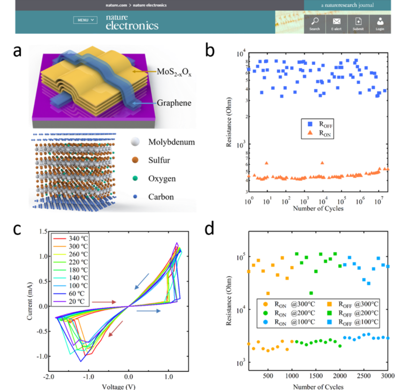 《自然·电子学》官网截图与基于二维材料的耐高温忆阻器:(a)器件结构示意图;(b)器件在脉冲电压操作下2×107次的稳定开关表现;(c)器件在20~340℃温度范围内的开关曲线;(d)器件分别在100℃、200℃和300℃高温下的1000次稳定开关表现。