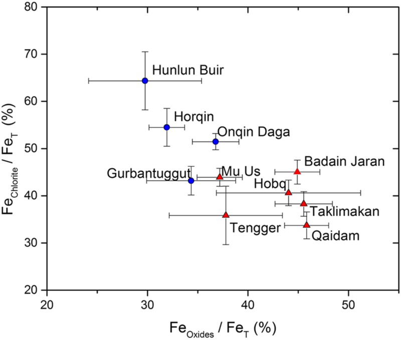 地球科学与工程学院季峻峰研究团队和地理科学与海洋学院鹿化煜研究团队合作,针对我国北方沙漠的地表沉积物样品,联合地球化学连续提取、漫反射光谱、X射线衍射等方法,着重研究了能够长距离传输粘土粒级(< 2 ?m)中的含铁矿物及其地球化学形态,获得主要认识有(1)中国主要沙漠表层沉积物粘粒中含铁矿物和铁形态西部沙漠和东部沙地存在明显空间分布差异,西部沙漠铁矿物和铁形态分布特征可能和青藏高原隆升存在联系;(2)塔克拉玛干沙漠中易还原铁氧化物含量高于其它沙漠,这种现象可能与盆地周围山脉剥蚀/风化所致通过高山作用输送至塔克拉玛干沙漠;(3)沙漠沉积物粘土粒级中潜在输送给太平洋的主要含铁矿物是针铁矿和绿泥石;(4)研究提供了东亚主要尘源区的含铁矿物及化学形态的数据,可能有效提高全球粉尘铁模型的基础数据之一。