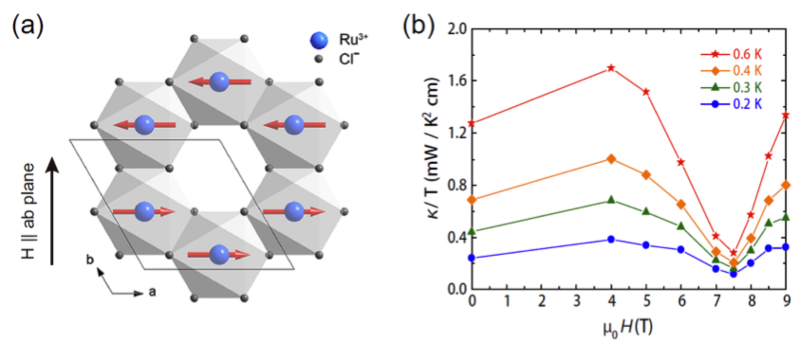 图1. (a) α-RuCl3的单层晶体结构。(b) 热导κ比温度T在不同温度下随磁场的依赖关系曲线,磁场方向平行于a-b面。