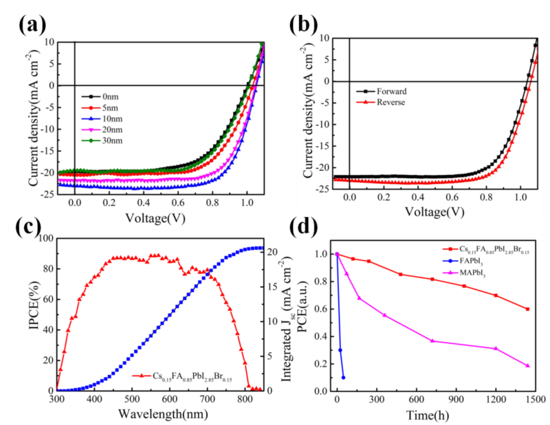 有机-无机杂化钙钛矿薄膜在可见光范围具有优异的光吸收和能带调控特性,以及较长的载流子寿命,近年来一直是研究关注的热点。然而,通常的钙钛矿材料(CH3NH3PbI3)热稳定性差,且对湿度敏感,也大大限制了其规模化光伏器件应用。如何提高其稳定性并保持较高的光电转换效率,一直是困扰钙钛矿材料进一步发展的问题。近日,凯发k8官网电子学院余林蔚教授课题组与合肥工业大学材料学院蒋阳教授团队合作,提出采用精确可控的叠层调控物理化学气相沉积技术(stack-sequence physical-chemical vapor deposition)制备混合阳离子掺杂、能带渐变的新型钙钛矿薄膜材料。此混合阳离子掺杂有机杂化钙钛矿薄膜,利用可规模化制备的气相淀积工艺,首先制备富集Cs、Br元素的表层钙钛矿和富集FA、I的内层叠层结构,然后经过低温退火相互扩散构建出具有能带梯度的钙钛矿薄膜,使其能充分并分布式吸收不同波段的入射光,从而实现18.22%的转换效率。令人兴奋的是,混合无机阳离子掺杂大大提高了器件的稳定性:器件放置在空气中两个月后,阳离子掺杂钙钛矿依旧能够保持较高的转换效率,这为实现规模化制备高性能稳定的掺杂钙钛矿电池提供了新思路。相关工作以凯发k8官网为第一单位发表在近期的《Nano Energy》上(DOI:10.1016/j.nanoen.2018.04.012.)。